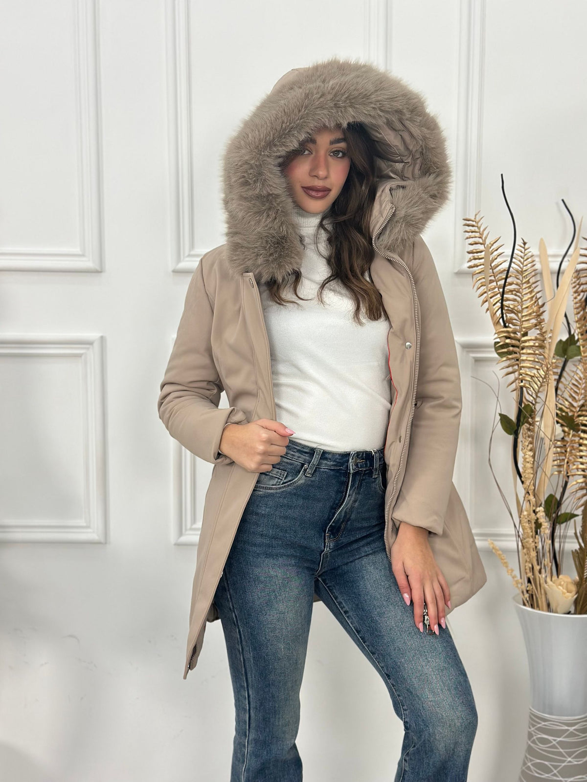 Giubbotto donna con cappuccio e pelliccia removibile lunghezza 3/4