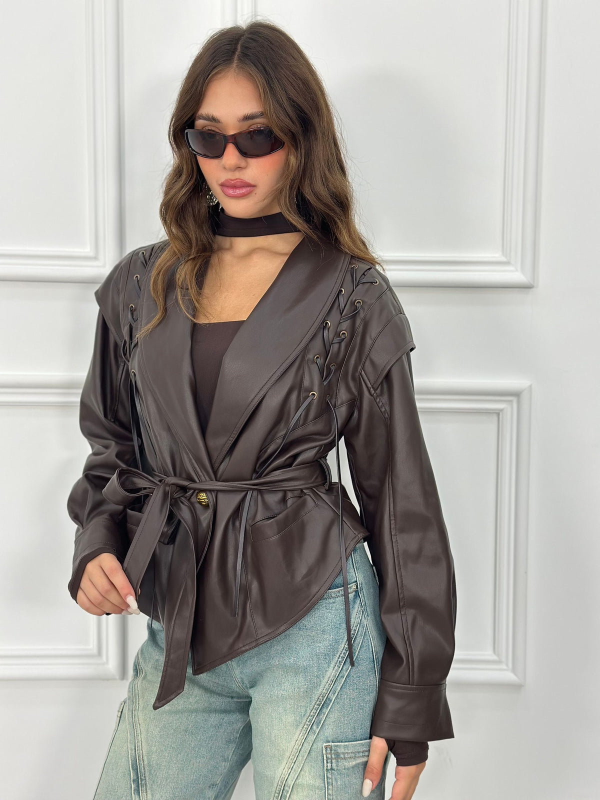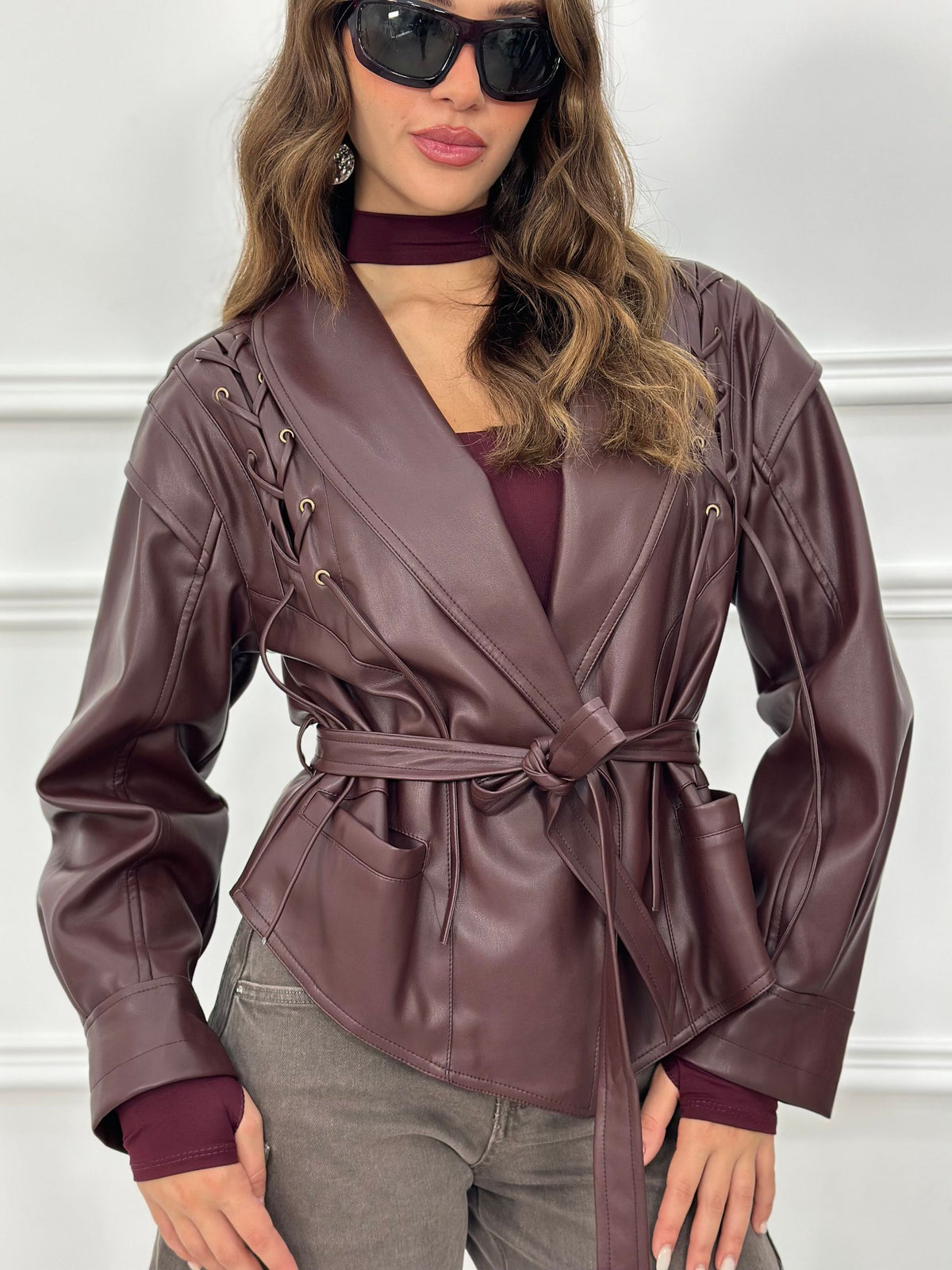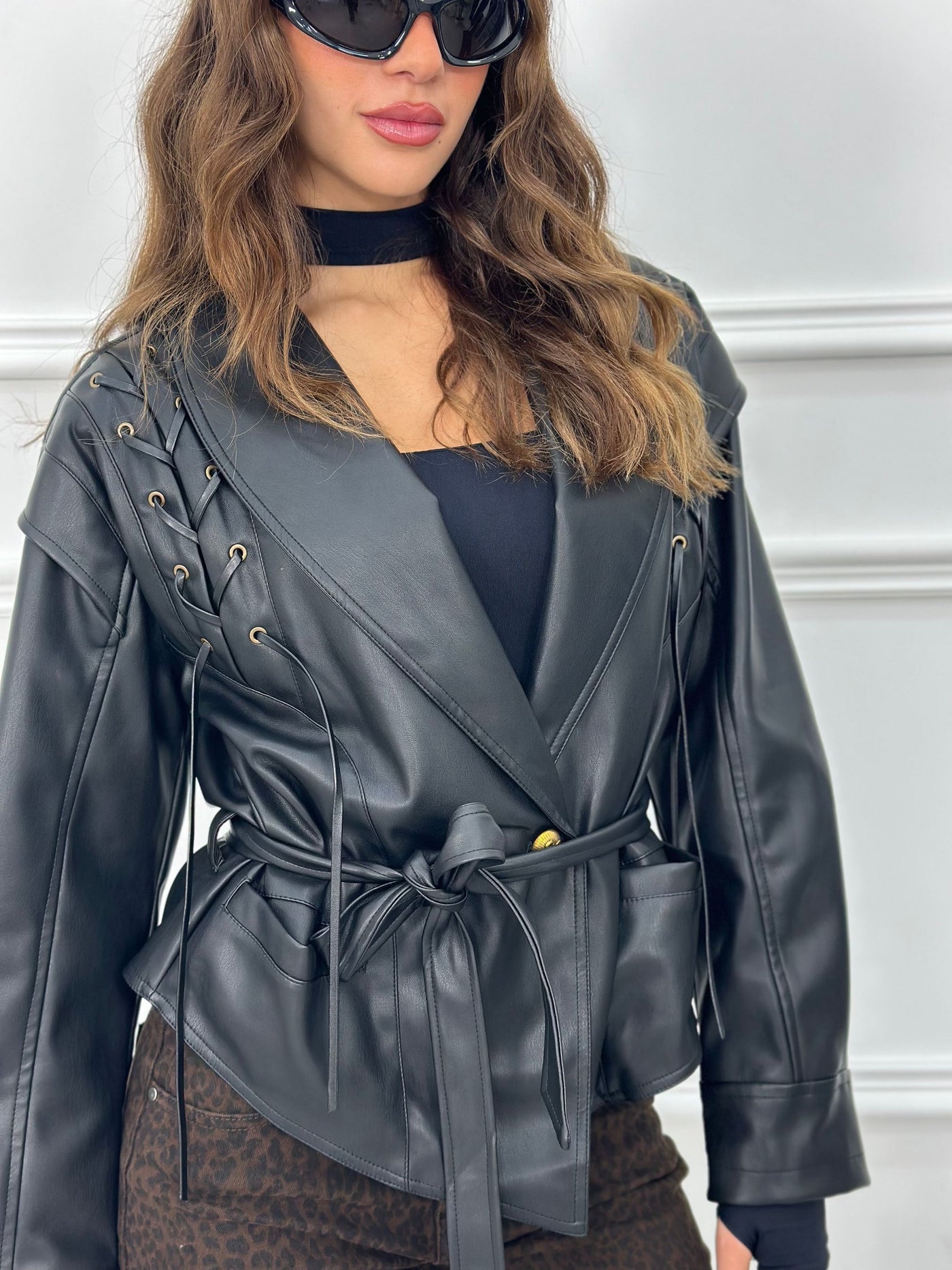 Giubbotto in ecopelle con cintura in vita e intrecci spalle
