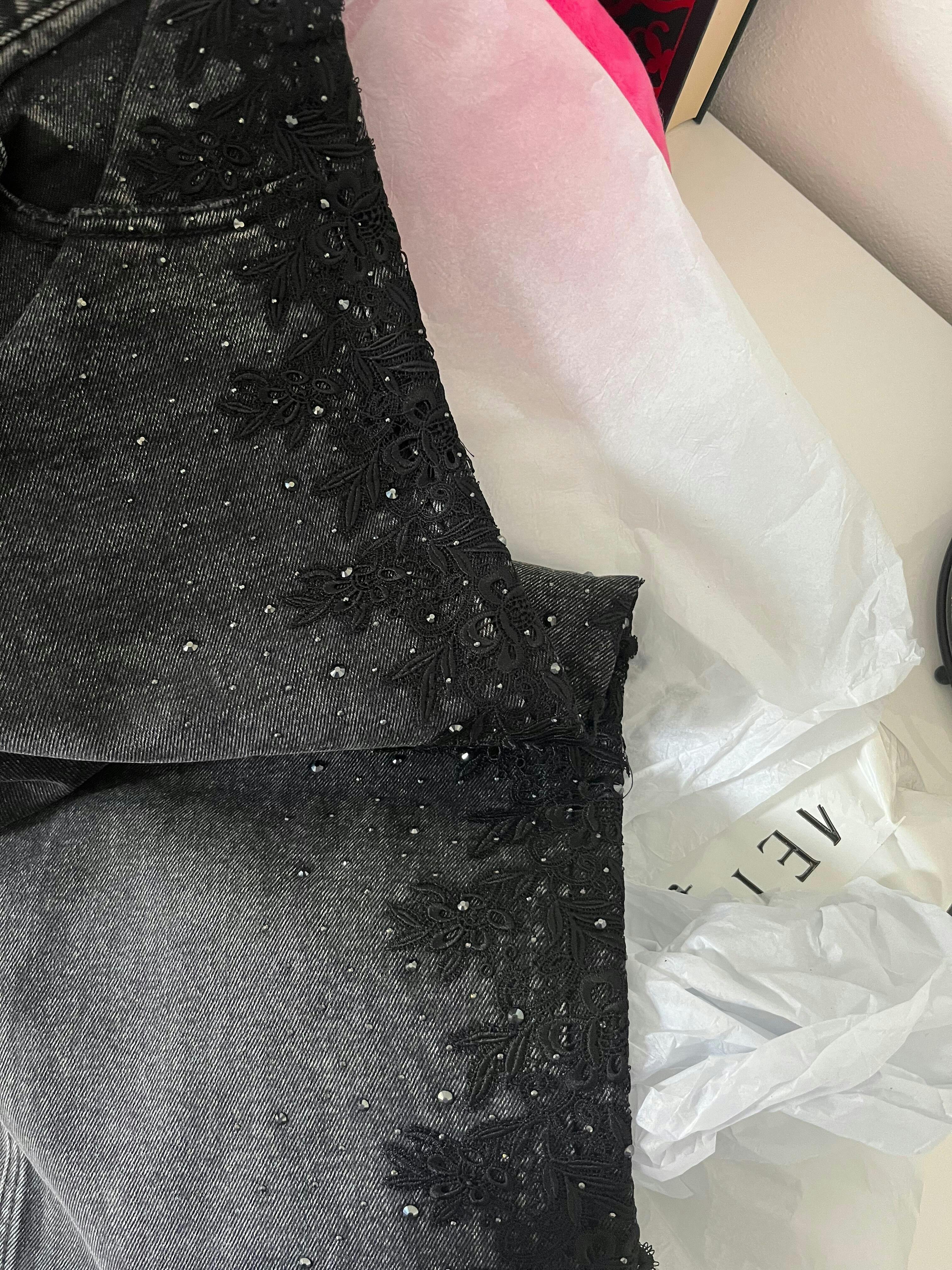 Jeans a palazzo con ricami in pizzo e brillantini su ilaterali