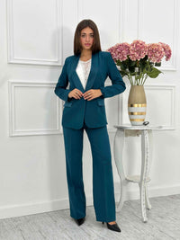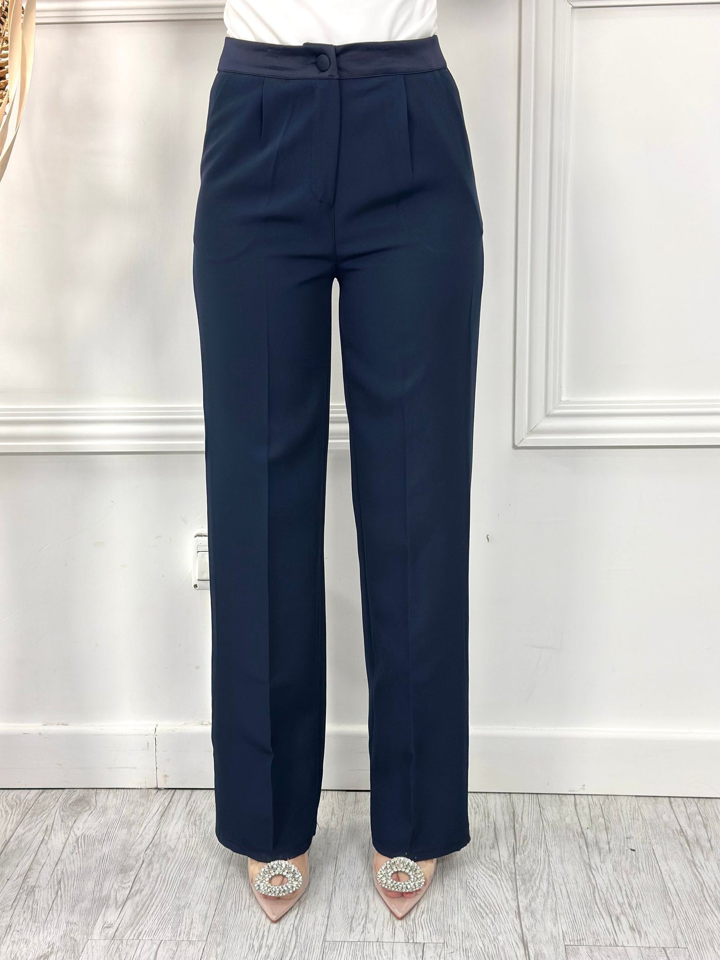 Tailleur con inserti in raso su collo tasche e girovita e pantalone a palazzo