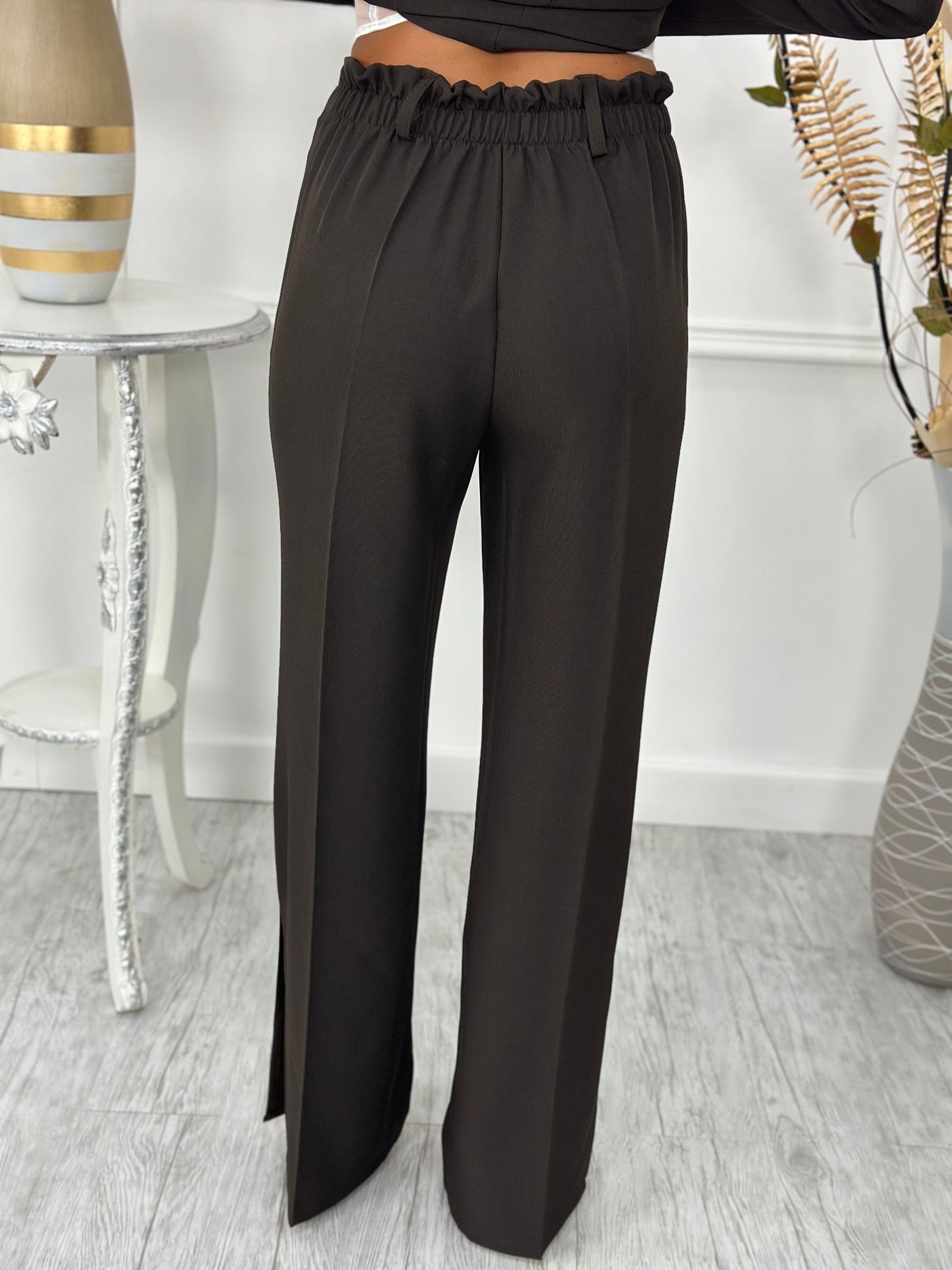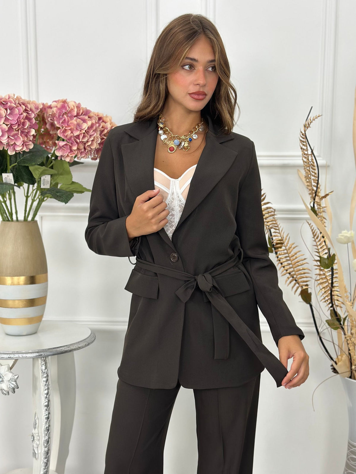 Tailleur composto da giacca con cintura e pantalone palazzo con elastico sul retro e spacchi