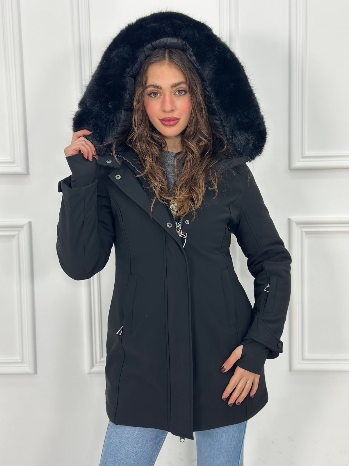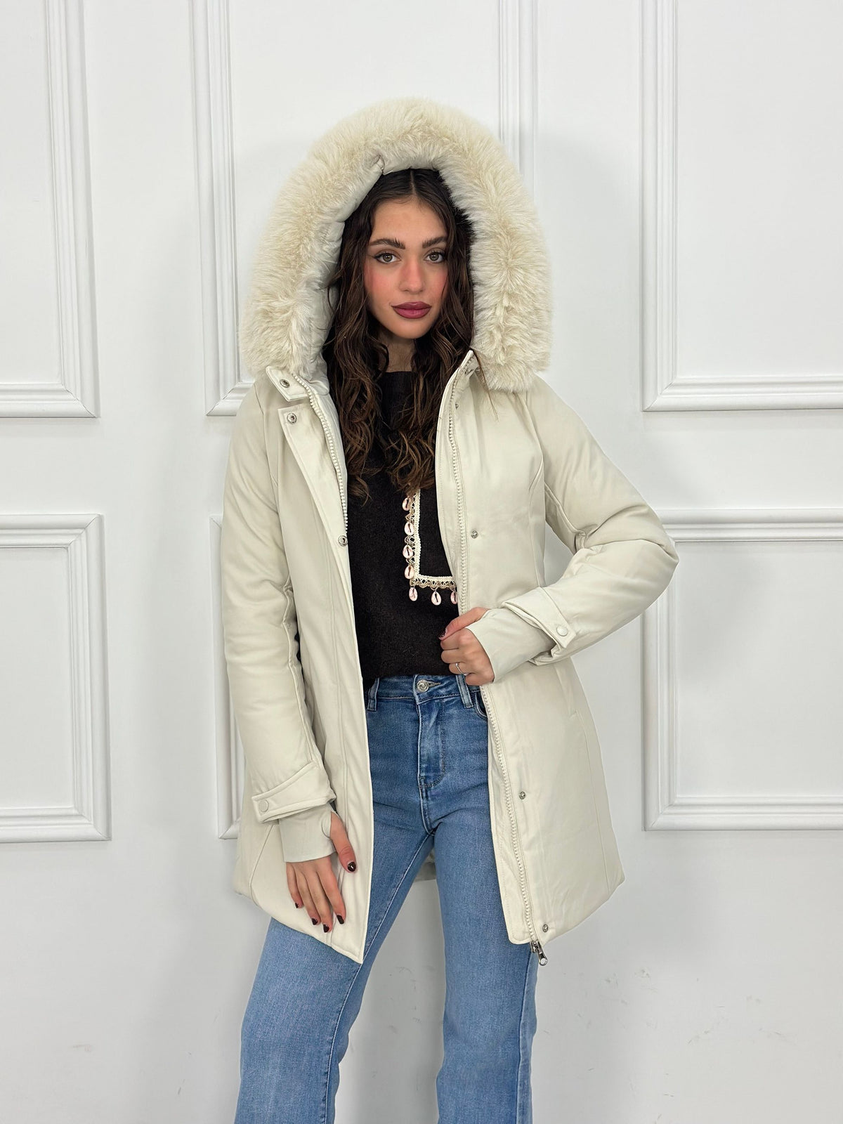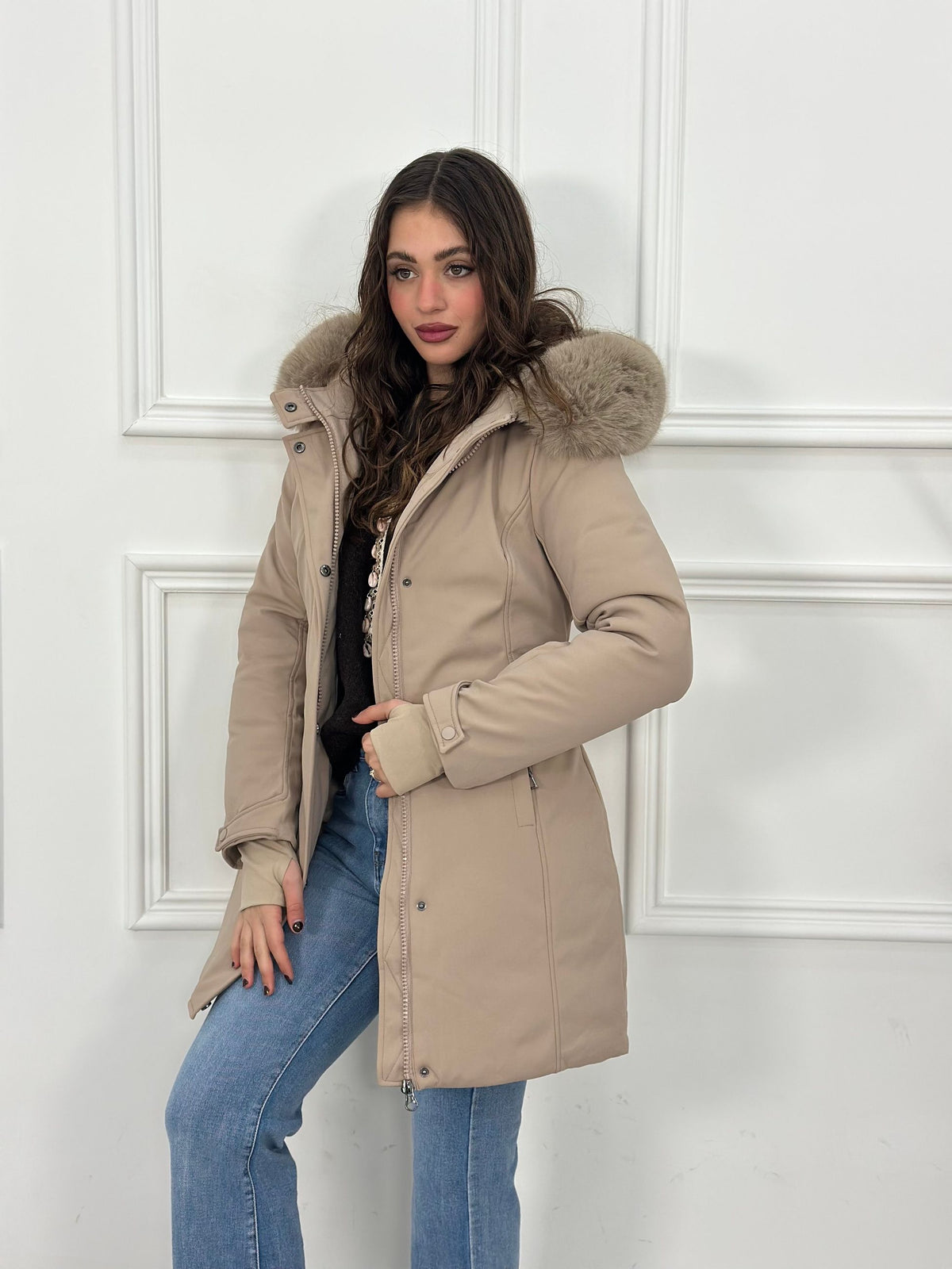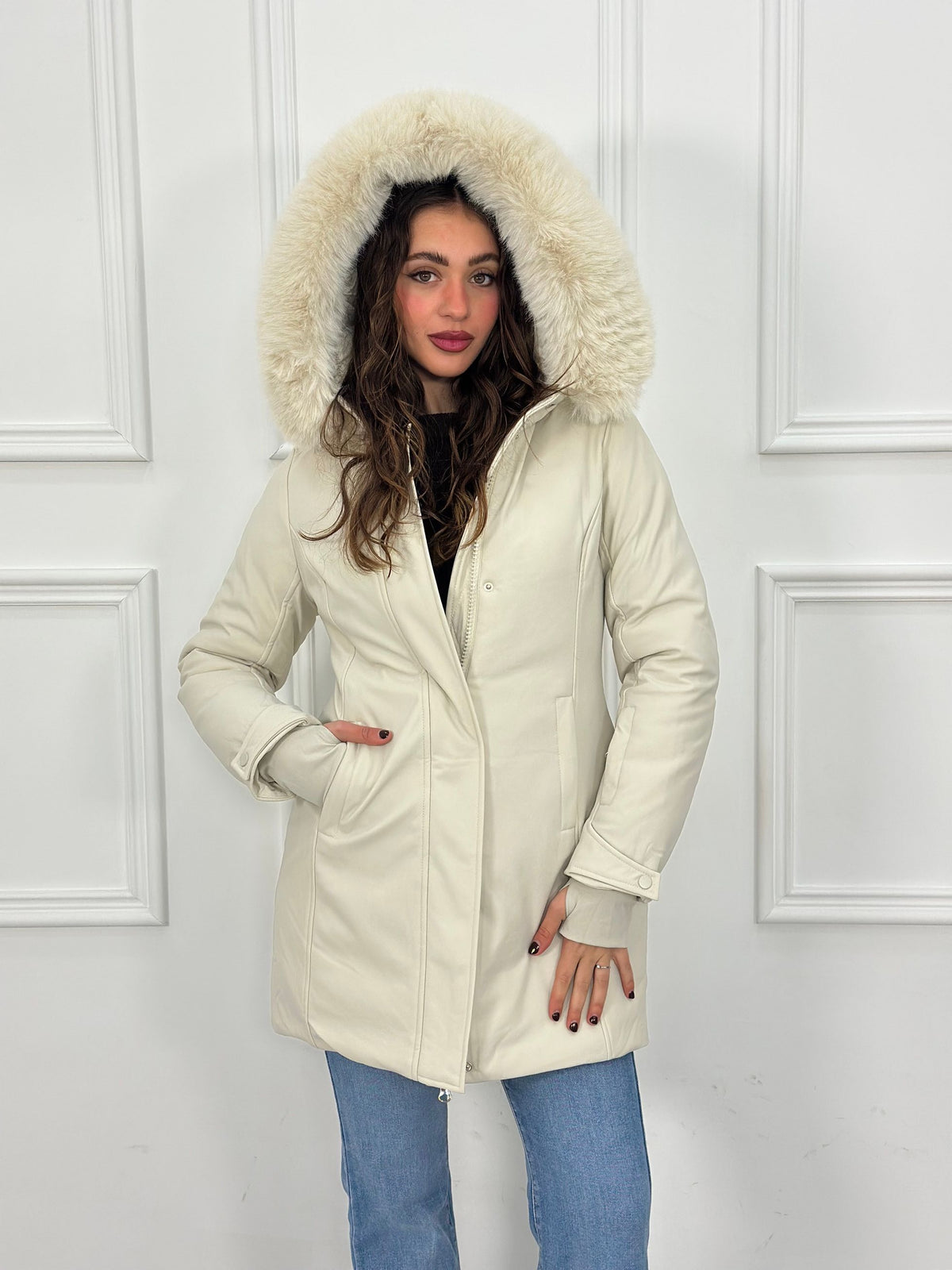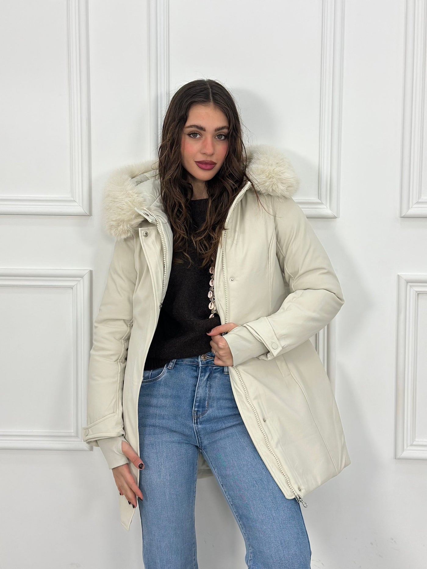Giubbotto inbottito con cappuccio e pelliccia removibile e maniche a guanto Top Quality