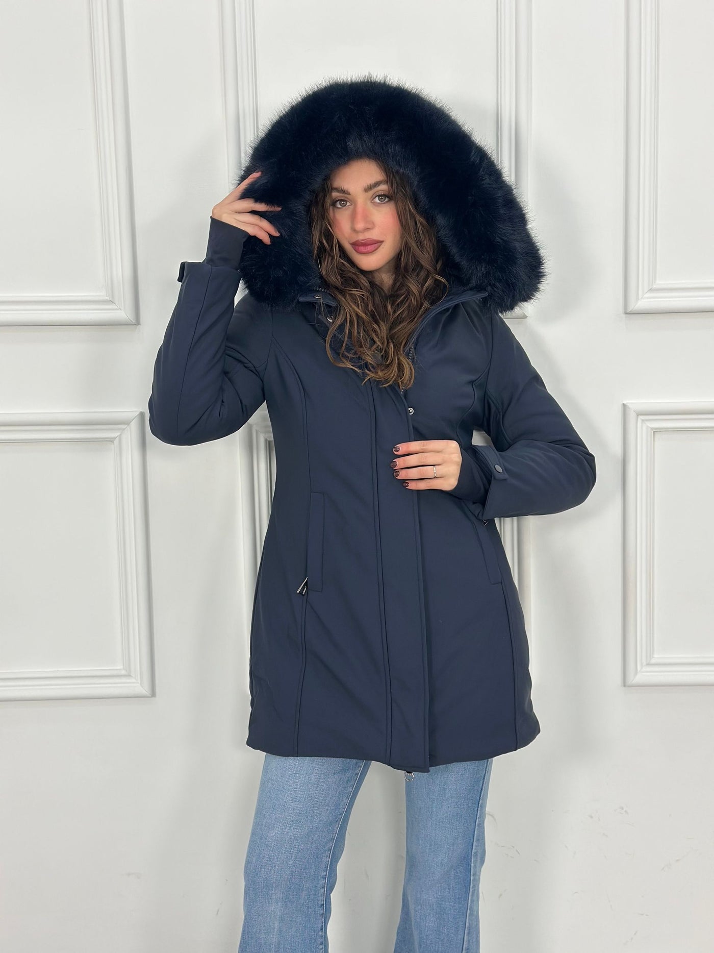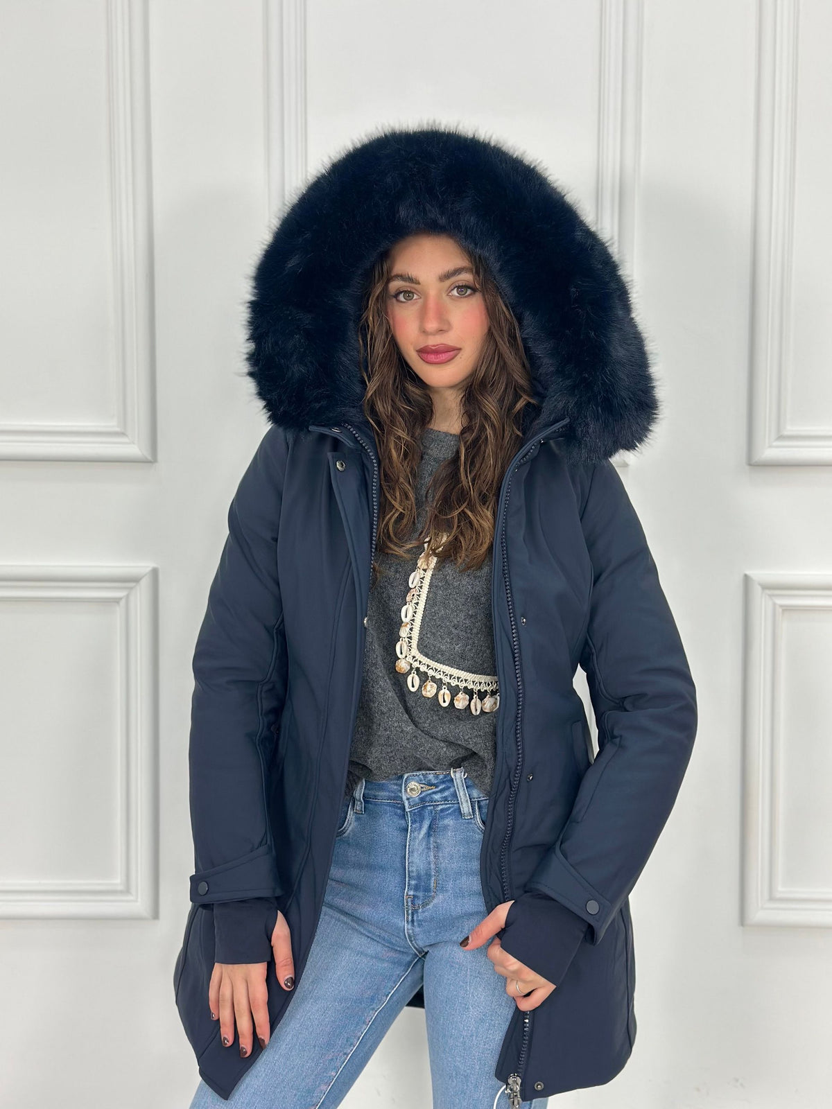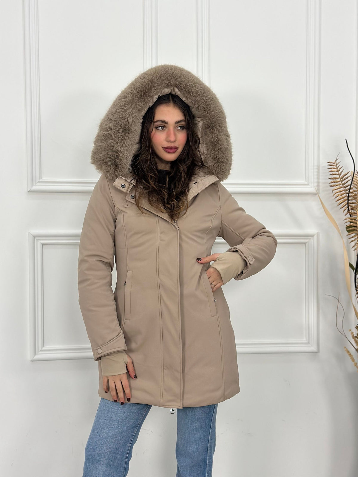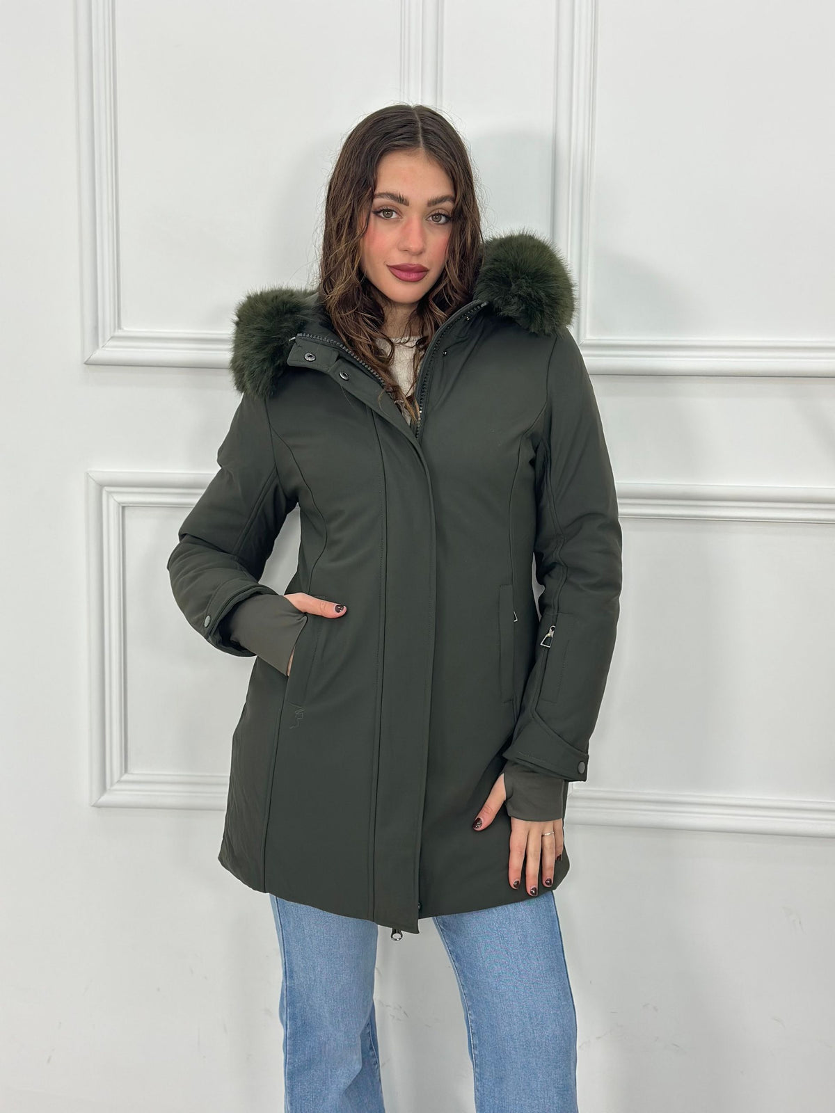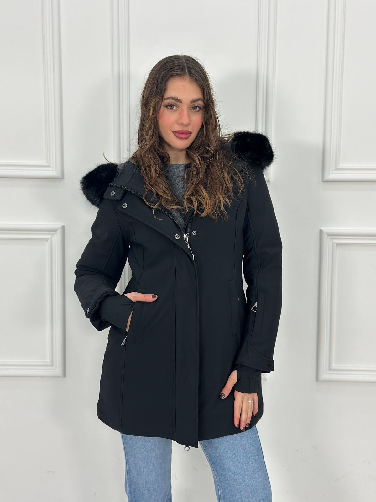 Giubbotto inbottito con cappuccio e pelliccia removibile e maniche a guanto Top Quality