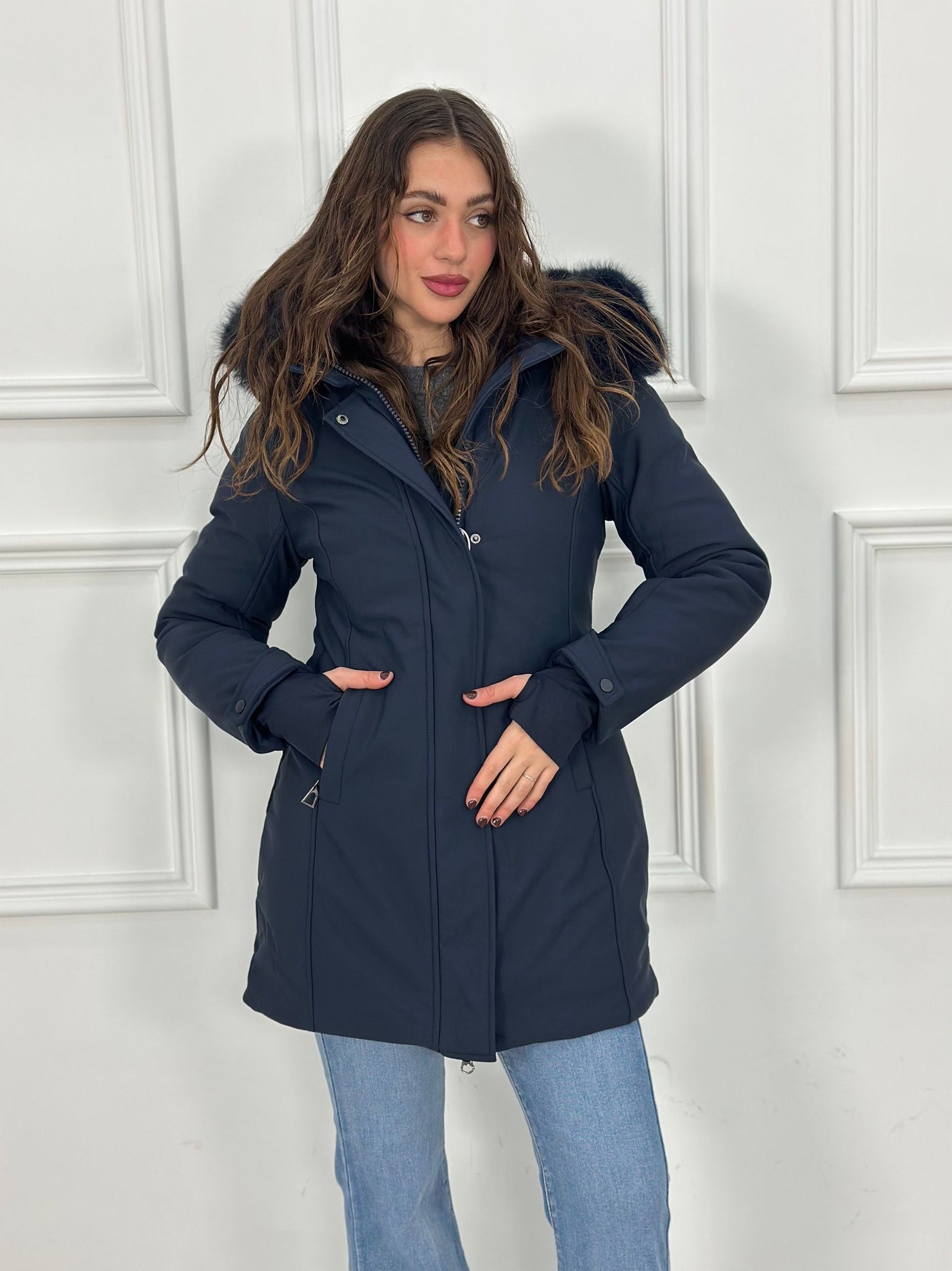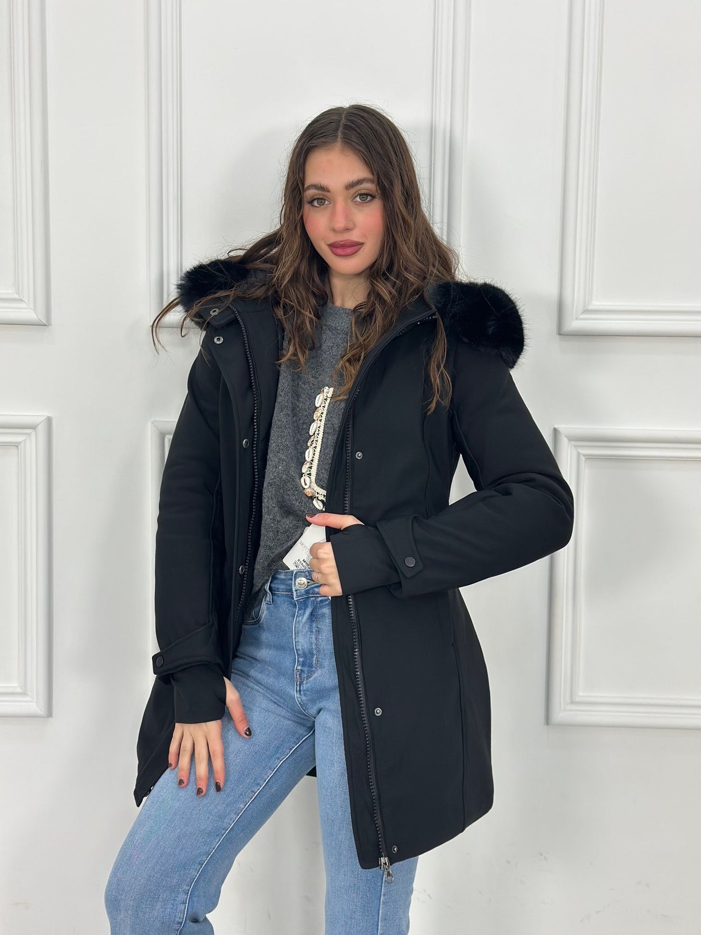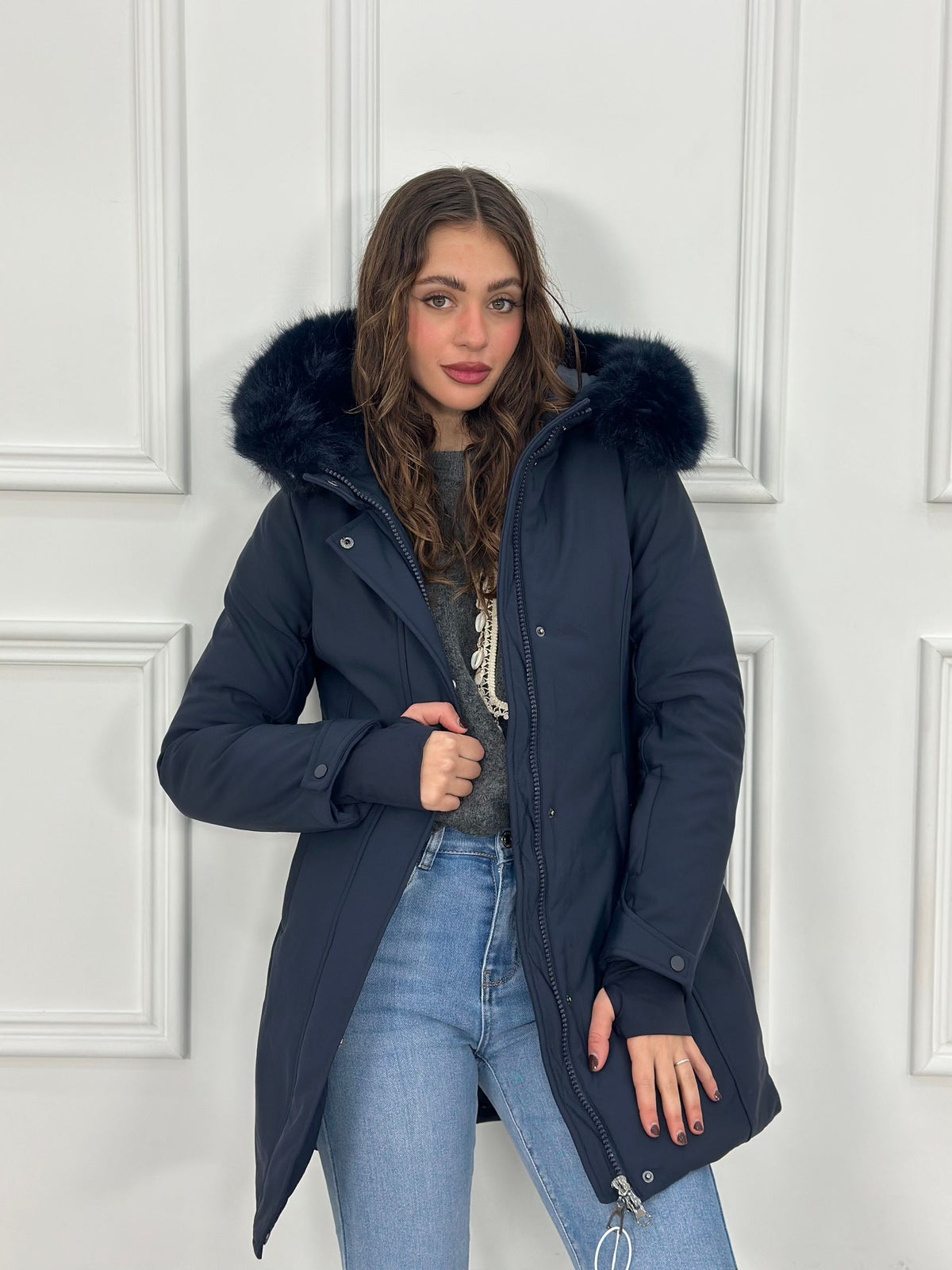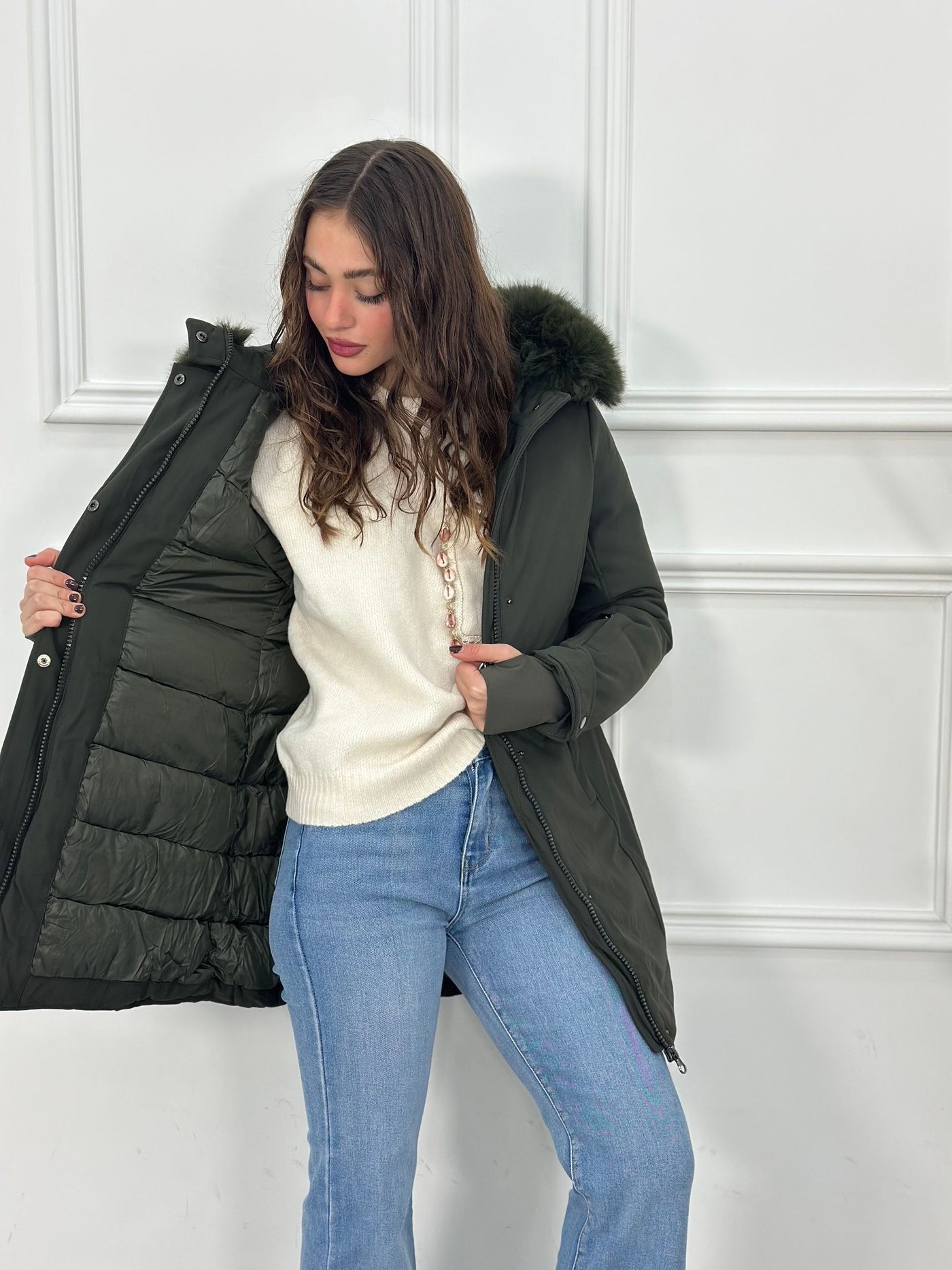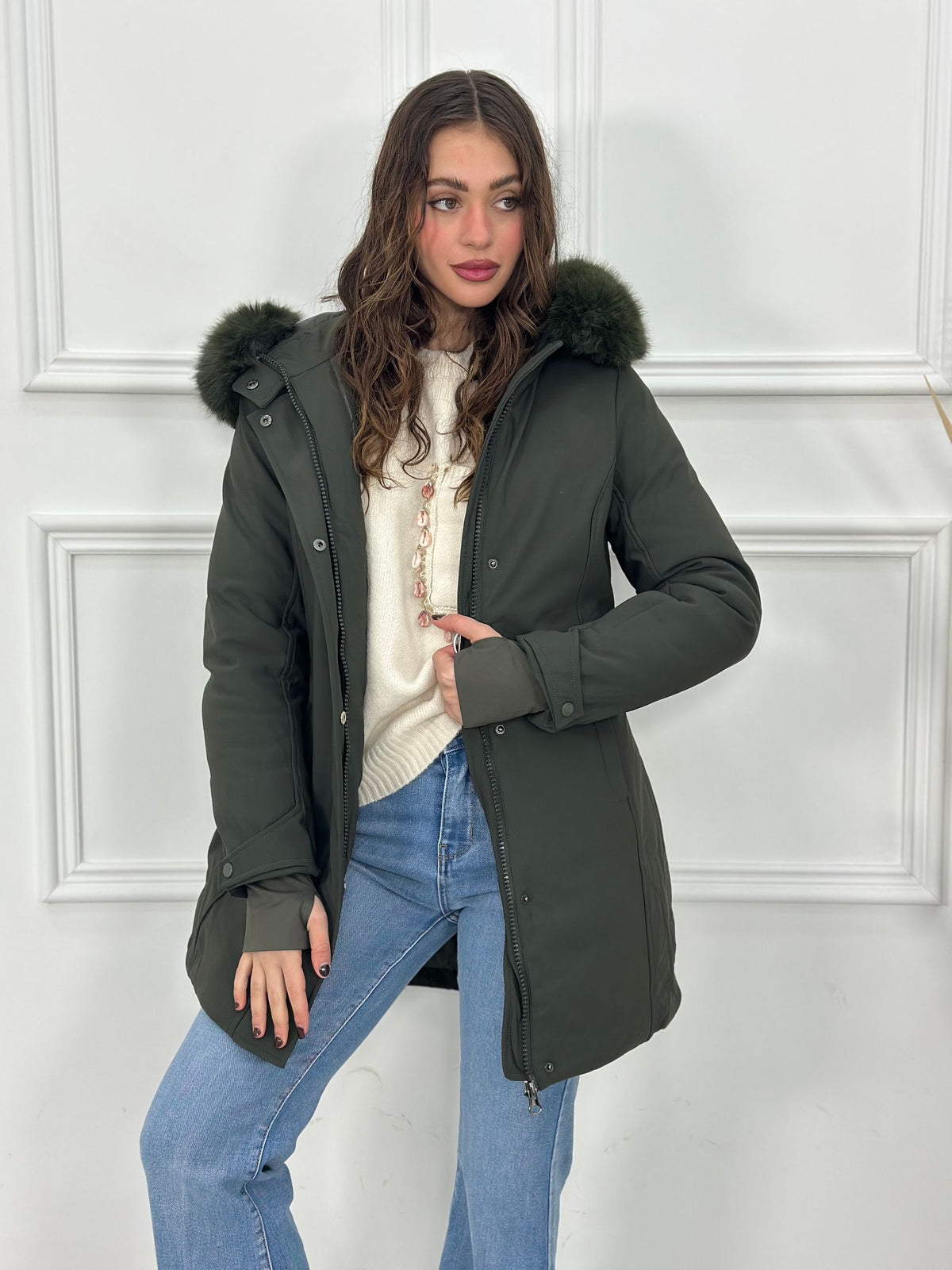 Giubbotto inbottito con cappuccio e pelliccia removibile e maniche a guanto Top Quality