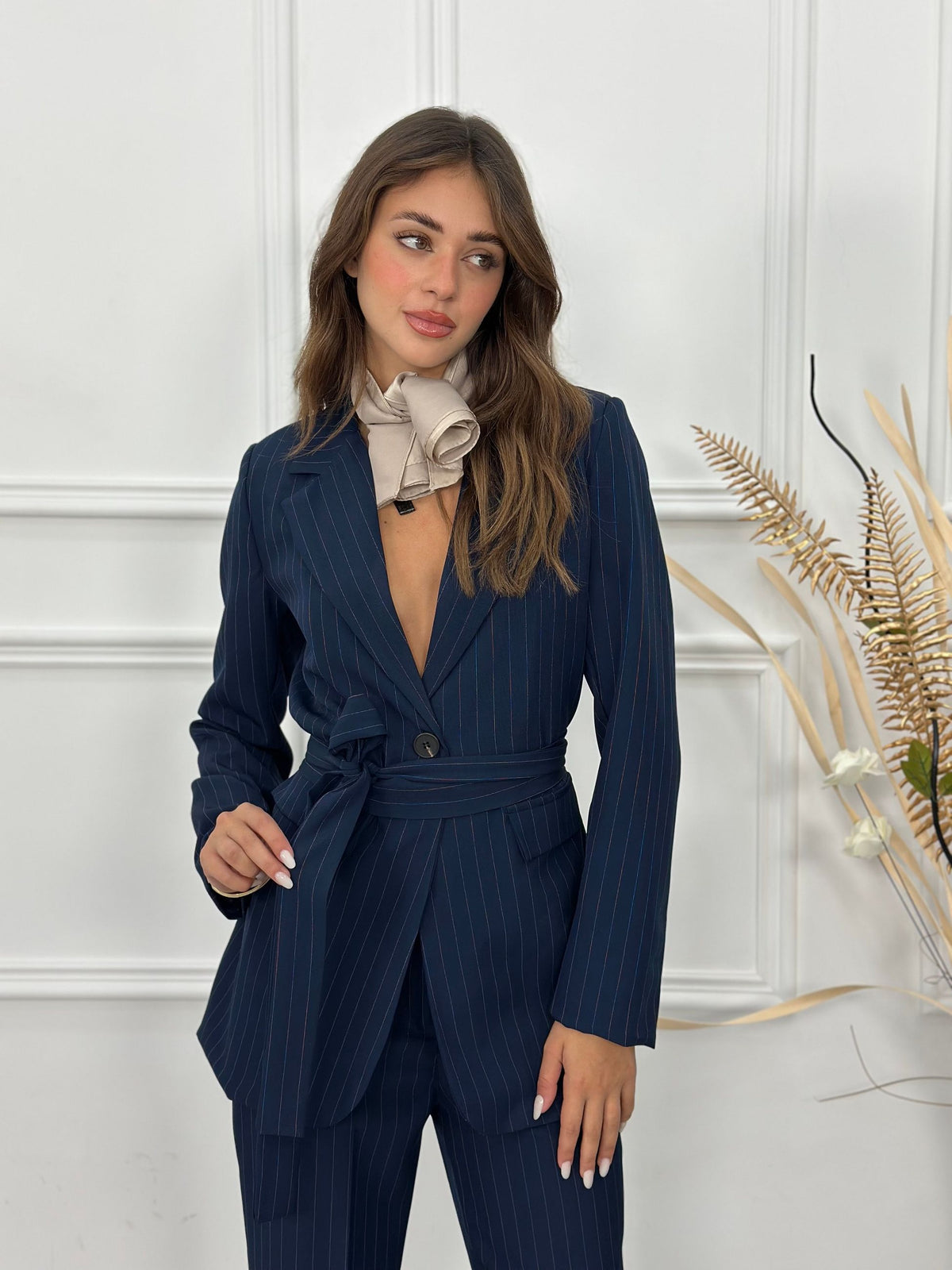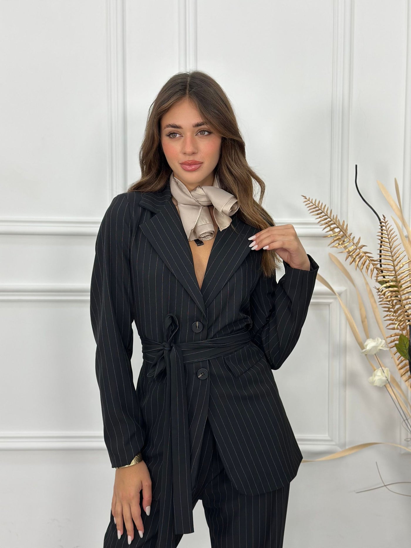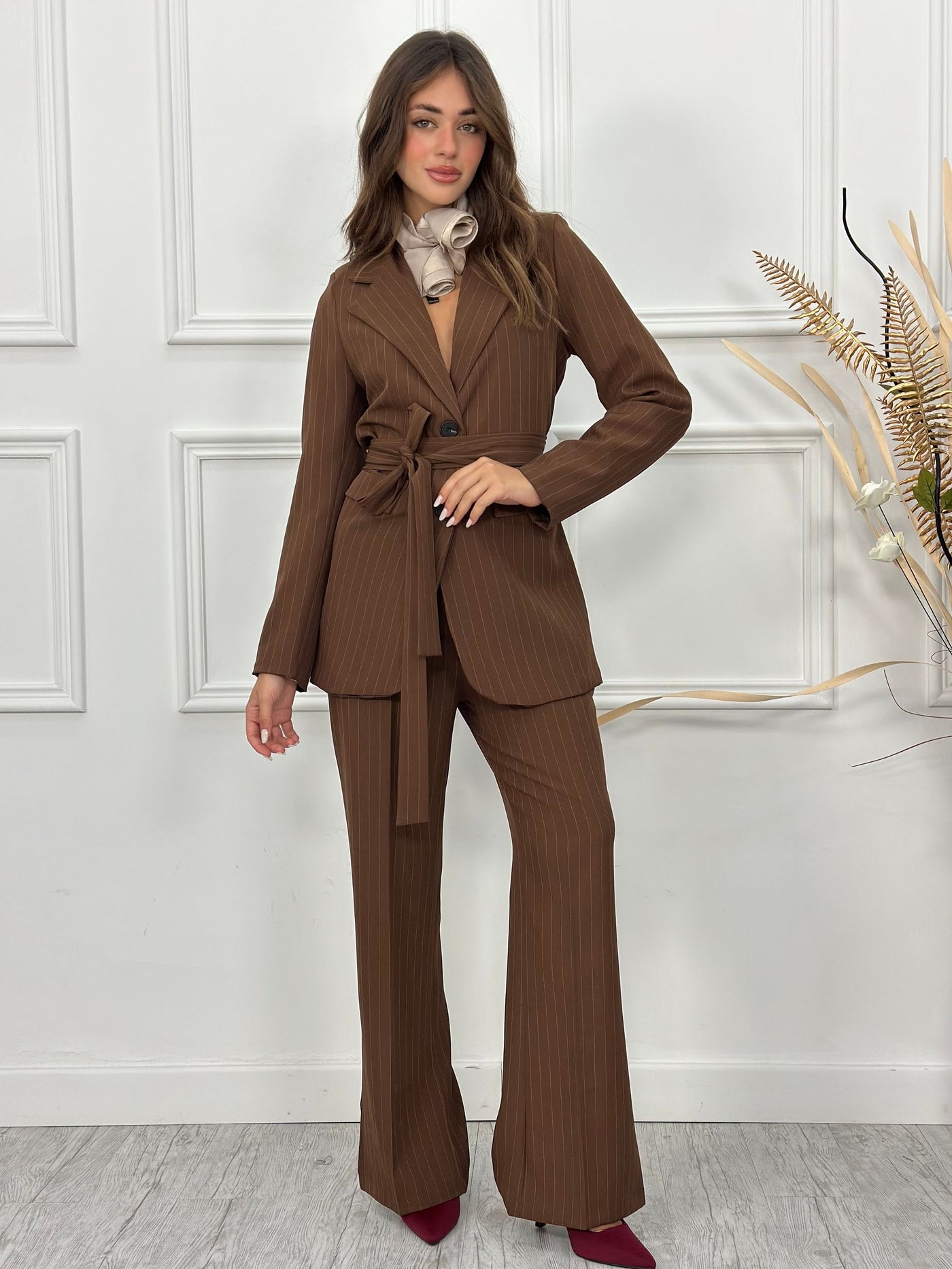 Tailleur gessato composto da giacca con cintura e pantalone a palazzo con elastico sul retro e spacco alle caviglia