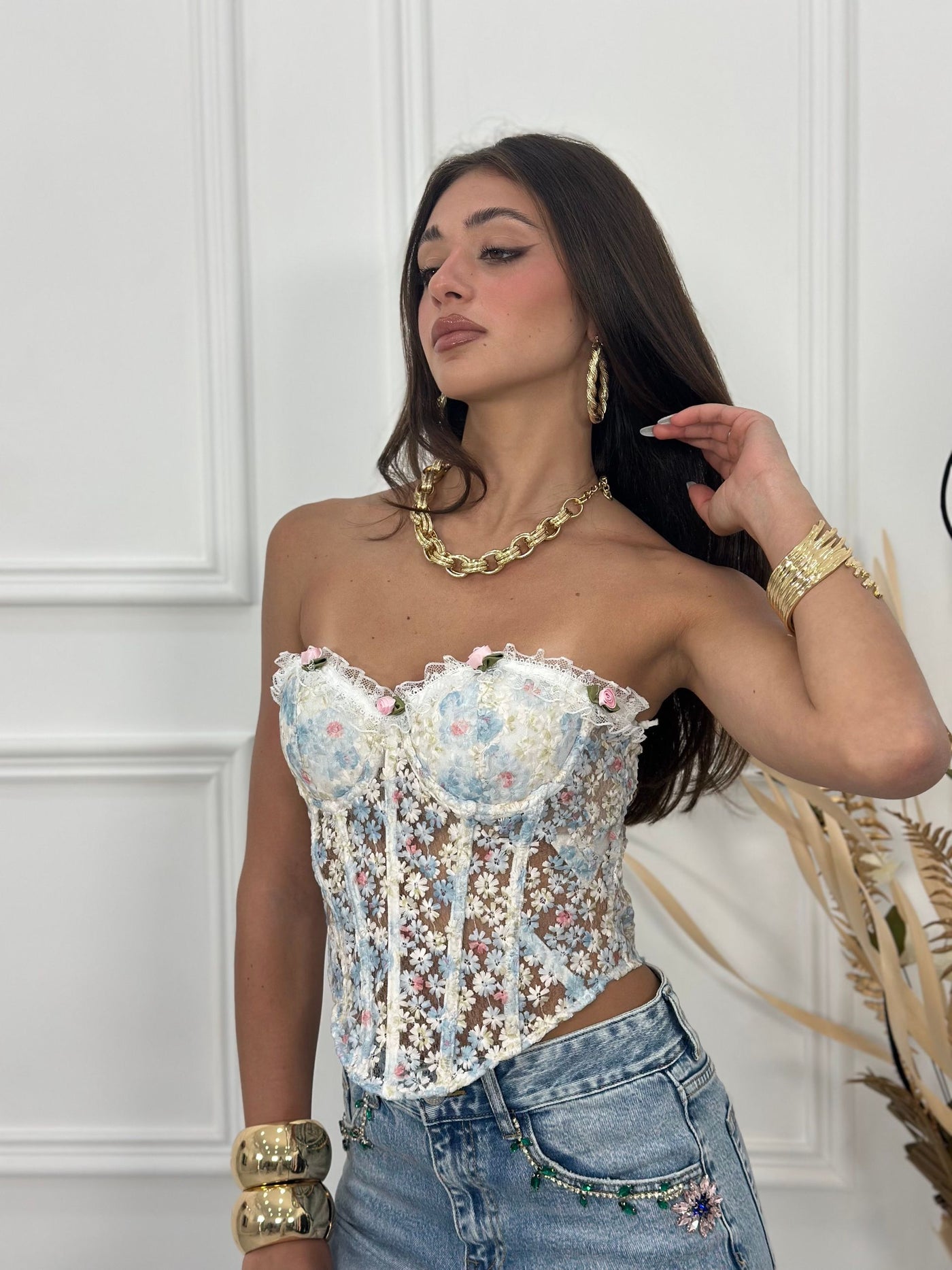 Top bustier a fiorellini con coppe e intrecci regolabili sul retro